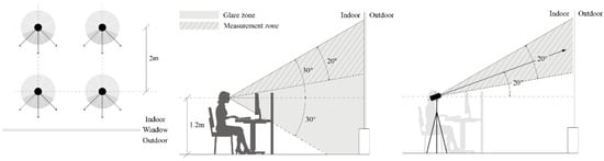 - Bian, Y.; Leng, T.; Ma, Y. A proposed discomfort glare evaluation method based on the concept of ‘adaptive zone’. Build Environ. 2018, 143, 306–317. [Google Scholar] [CrossRef]