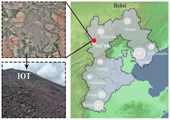 Tailings are solid waste generated inevitably during the mining process, contributing to air, soil, and groundwater pollution while also triggering geological hazards [10]. In China, the total production of tailings has surpassed 600 million tons, with iron ore tailings (IOT) accounting for approximately 40% of this total. However, the overall utilization rate of tailings remains below 20%, with IOT exhibiting a utilization rate of less than 7% [11,12,13]. The high iron ion content in IOT makes its accumulation prone to acid mine drainage [14,15], leading to water pollution, severe land degradation, and latent geological hazards [16]. In Huai’an County, Hebei Province, China, abundant iron ore resources exist, as shown in Figure 1. Nevertheless, historical mining activities have left nearly a hundred IOT reservoirs and substantial IOT deposits, exerting immense pressure on land resources and causing ecological deterioration. Currently, the comprehensive and efficient utilization of IOT represents a critical issue that local governments urgently need to address. On one hand, this is in pursuit of recycling IOT and facilitating ecological restoration. On the other hand, it aims to meet the increasing demand for construction materials while driving economic development in resource-depleted regions. Therefore, it is imperative to make full use of IOT and implement eco-friendly brick production.