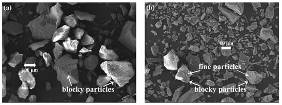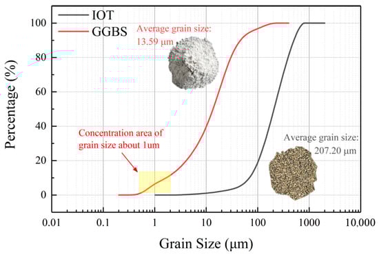 GGBS was procured from a material company in Gongyi, Hebei Province. As shown in Figure 2, the grain size distribution of GGBS primarily fell within the range of 1–35 μm, with an average grain size of 13.59 μm, which was one order of magnitude smaller than that of the IOT. Notably, there was a small grain size distribution of around 1 μm, accounting for approximately 10% of the total. GGBS exhibited an average specific surface area of 491 m2/kg, which was 20 times greater than that of IOT, indicating a propensity for the alkali activation reaction. The major chemical components of GGBS are presented in Table 1, with SiO2, Al2O3, and CaO contents at 34.50%, 17.70%, and 34.00%, respectively. Figure 4b depicts the microscopic morphology of GGBS, which is characterized by irregular blocky particles with a minor amount of fine particles adhering to the surface.