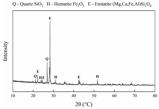 IOTs were obtained from a mining site in Huai’an, Hebei Province. The grain size distribution and specific surface area of the raw material were determined using a Chinese BT-9300HT laser grain size analyzer, as shown in Figure 2. The grain sizes were mainly distributed in the range of 100–500 μm, with an average grain size of 207.20 μm. Additionally, the average specific surface area of IOT particles was measured to be 20.52 m2/kg. X-ray fluorescence (XRF) analysis was employed to determine the chemical composition of the material, and the results are presented in Table 1, with SiO2, Al2O3, and CaO content of 54.41%, 13.84%, and 8.30%, respectively. Notably, the content of Fe2O3 was found to be 13.01%. Figure 3 shows the XRD image of IOT, indicating the main mineral components of IOT include Hematite (Fe2O3), Enstatite [(Mg, Ca, Fe, Al)Si2O6], and Quartz (SiO2). Due to its high Enstatite content, IOT can provide alkali metal ions with large ionic radii, such as Mg2+, Ca2+, and Fe3+. These alkali metal ions can induce distortions in the aluminosilicate glass, disrupting the weaker -O-Al-O- bonds and increasing non-bridging oxygen sites, thereby reducing the polymerization degree [36,37,38]. Figure 4a depicts the microscopic morphology of IOT, which exhibits a rough, irregular, and fragmented surface that forms larger pores upon accumulation.