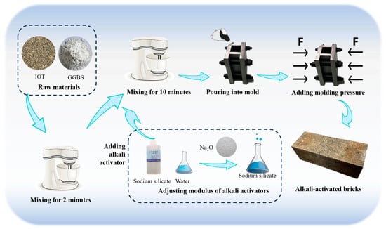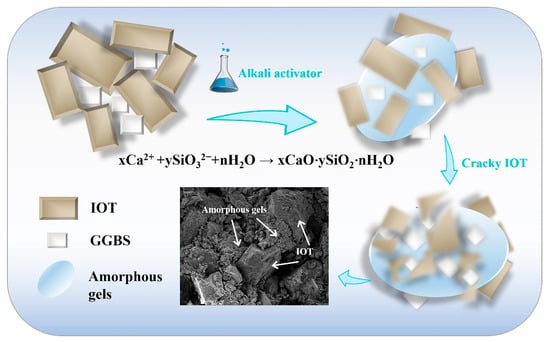 In fact, IOT is a type of fine-grained solid waste rich in SiO2 and Al2O3, with the potential for pozzolanic activity [17,18]. Utilizing IOT as a mineral admixture in the production of construction materials, such as bricks [19], cement [20,21], and concrete [22,23], is considered a viable approach that contributes to waste utilization and sustainable development. Currently, numerous studies have examined the feasibility and methods of producing bricks from IOT. Fontes et al. [24] demonstrated that increasing the bulk density of IOT and adjusting the water content could enhance the mechanical properties of IOT bricks. Mendes et al. [25] investigated the feasibility of preparing sintered bricks from a mixture of low-dose IOT and clay, with optimal results achieved at a mass ratio of 29.1% for IOT, meeting international standards. Chen et al. [26] utilized a mixture with a mass ratio of 84:10:6 for IOT, clay, and fly ash, employing a process involving mixing, forming, drying, and firing to produce high-content sintered bricks, effectively utilizing IOT. Yang et al. [27] added fly ash to low-silicon IOT and produced sintered bricks at temperatures between 900 and 1000 °C. Mechanical tests showed that these bricks could serve as substitutes for traditional clay or shale-based bricks. Luo et al. [28] employed a blend of IOT and coal gangue powder as primary materials and shale and sludge as binders to successfully produce composite sintered bricks. The study revealed that with increasing sintering temperature, pseudo-crystalline mineral particles significantly increased, accompanied by the appearance of glassy liquid phase inclusions and fine-grained pseudo-crystalline mineral particles, resulting in a more uniform and denser surface. Zhao et al. [29] used a mixture of 70% IOT, 15% lime, and 15% sand to produce steam-pressed bricks, investigating the hydration process of the IOT-lime-sand system. Analysis via XRD, DSC, IR, and SEM revealed that tobermorite played a pivotal role in determining the strength of the steam-pressed bricks. Liu et al. [30] demonstrated that under the influence of alkali activators, IOT could increase specific surface area, enhance surface energy, and promote the formation of a significant amount of needle-like ettringite (AFt) and calcium silicate hydrate (C-S-H) gel, leading to a denser microstructure. H.K. and Hossiney [31] successfully produced alkali-activated bricks using fly ash, GGBS, and IOT as the raw materials. However, it is worth noting that the utilization of IOT in alkali-activated bricks could meet the construction standards only when the IOT content was below 50%. In summary, previous research clearly demonstrated the feasibility of using IOT for brick production. However, most high-content IOT bricks are either traditional sintered or steam-pressed bricks, whereas the utilization of IOT in low-energy and low-pollution alkali-activated bricks remains relatively low.