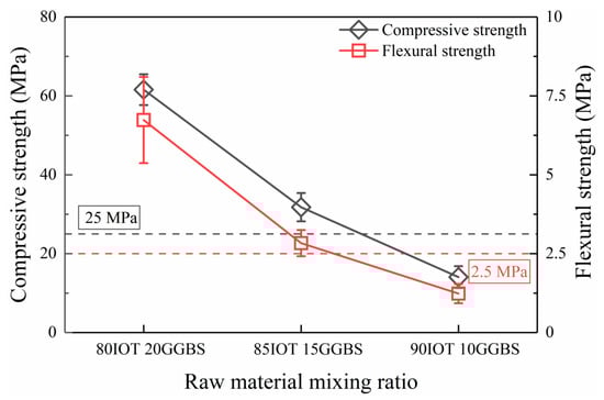 The results of the mechanical performance test of the bricks are presented in Figure 6, where the black dashed line represents the compressive strength of the JC/T422-2007 MU25, and the red line represents the flexural strength. The results indicate that both the compressive and flexural strengths of the bricks significantly decreased as the IOT content increased (or GGBS content decreased). The compressive strength dropped by half from 61.55 MPa at 80% IOT content to 31.72 MPa at 85% IOT content and continued to decline to 14.05 MPa at 90% IOT content, where the compressive strength no longer met the MU25 standard. Similarly, the flexural strength gradually decreased from 6.86 MPa at 80% IOT content to 1.23 MPa at 90% IOT content, and at 90% IOT content the flexural strength also failed to meet the MU25 standard. The reason for the strength reduction was the decrease in the content of GGBS, which had stronger alkaline activity. Almost all GGBS particles had smaller grain sizes than the IOT particles (Figure 1). Therefore, with less GGBS content, there was a lower amount of C-S-H gel generated via the alkali-activated reaction covering the surface of IOT particles and filling the pores [40]. Consequently, the tight bonding between IOT particles was weakened. Furthermore, when the IOT content was too high, the overall alkali activity of the samples decreased, resulting in a lower degree of alkali-activated reaction. Based on the test results, the optimal raw material mixing ratio to meet the MU25 standard for high-strength and high-content IOT bricks was IOT:GGBS = 85:15.