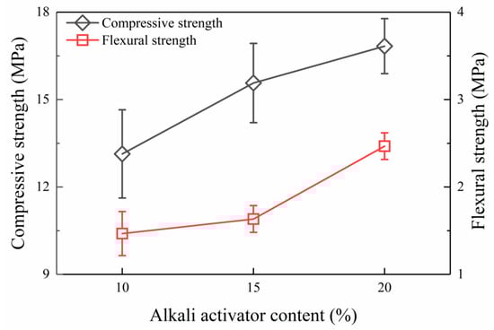 The compressive strength and flexural strength of bricks with different alkali activator contents.