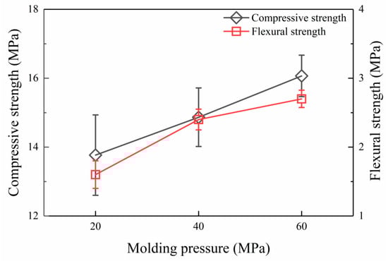 The molding pressure directly affected the degree of contact degree between the material particles and the alkali-activating solution, thereby influencing the compactness of the bricks. The mechanical performance test results of the alkali-activated bricks prepared at molding pressures of 20, 40, and 60 MPa are shown in Figure 9.