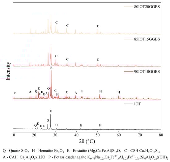 The XRD patterns of IOT and alkali-activated IOT-GGBS bricks are presented in Figure 11. The XRD patterns of the IOT-GGBS bricks reveal that the primary products of the alkali-activated reaction were C-S-H gel (calcium silicate hydrate, Ca5H2O18Si6) and C-A-H (Calcium Aluminum Oxide Hydrate, Ca3Al2O6XH2O). Some diffraction peaks corresponded to Potassicsadanagaite, Enstatite, and Quartz.