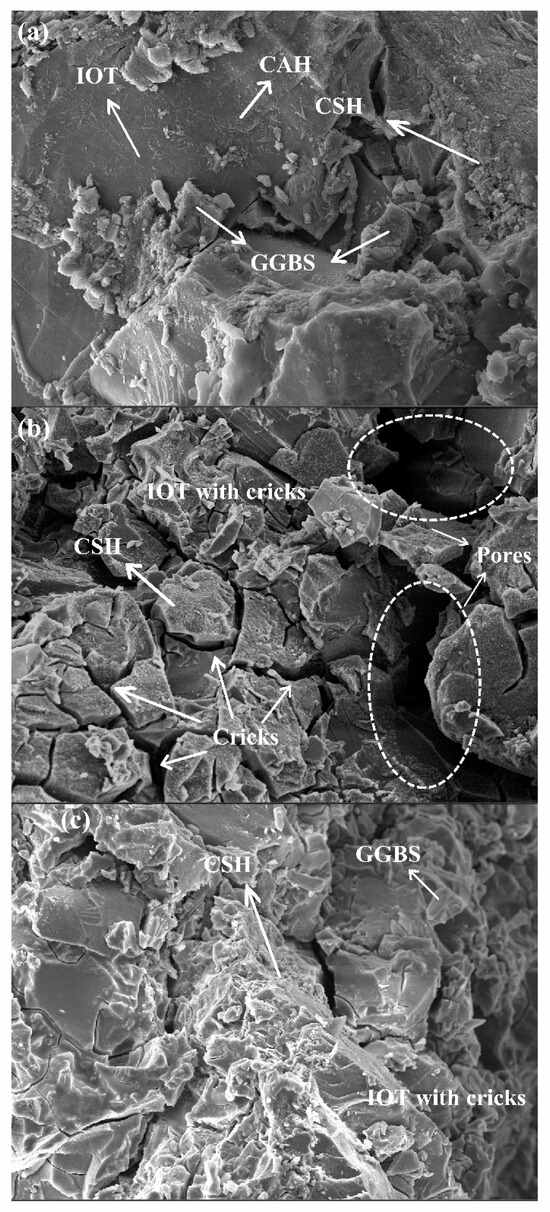 SEM images of alkali-activated IOT-GGBS bricks with (a) 10% content GGBS; (b) 15% content GGBS; (c) 20% GGBS content.