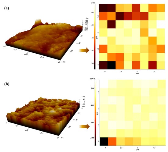 AFM morphology scanning (10 μm× 10 μm) was conducted on alkali-activated IOT-GGBS bricks, and the microscale stiffness was calculated using XEI 4.3.4 software. The small scale of the probe led to variations in the measured microscale stiffness, resulting in relatively small numerical values. However, the trends remain convincing and representative. Figure 14a,b depict the 3D AFM morphology of IOT in alkali-activated IOT-GGBS bricks with 20% and 10% GGBS, along with the microscale stiffness matrix. For alkali-activated bricks containing 20% GGBS, although the surface of IOT particles (with an approximate grain size of 200 μm) exhibited some undulations and a small amount of granular C-S-H, it appeared relatively smooth, lacking pronounced graininess. In contrast, in alkali-activated bricks with 10% GGBS content, the surface of the IOT particles was notably rough, with the presence of numerous C-S-H particles. This significant difference suggested that incorporating more GGBS into IOT as a precursor facilitated the progress of alkali activation reaction within the IOT-GGBS system. As a result, more C-S-H gels were generated, enveloping the IOT particles and leading to a smoother surface. Furthermore, the presence of unbound C-S-H particles (Figure 14b) on the surface of the IOT indicated that the alkali activation reaction on the IOT surface had a lower degree of progress.
