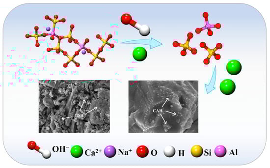 Additionally, based on the XRD diffraction analysis results (Figure 11) and Table 2, both IOT and GGBS contained substantial amounts of calcium. Alkali metal ions were known to disrupt the weaker -O-Al-O- bonds in aluminosilicate glass structures and increase the non-bridging oxygen, leading to reduced polymerization and increased reactivity [36,37]. In the alkaline environment provided by the alkali activator, the soluble silica on the surfaces of GGBS and IOT particles underwent dissolution and acted as nucleation sites [46]. As shown in Figure 16, a substantial quantity of [OH]- could disrupt the Si-O-Al-O-Si and Si-O-Si bonds within the aluminosilicate glass network, initiating the depolymerization of the glass matrix into [SiO4]4− and [AlO4]5− tetrahedrons while releasing a large amount of Ca2+ ions. Subsequently, Ca2+ ions combined with the depolymerized [SiO4]4− and [AlO4]5− tetrahedrons, ultimately forming the essential C-S-H gels and C-A-H that contributed significantly to the strength of the alkali-activated IOT bricks. As the reaction progressed further, IOT particles underwent fragmentation, leading to the formation of multiple smaller fragments. Consequently, the solution and small GGBS particles infiltrated the interior of the IOT particles, facilitating the continued generation of additional C-S-H gel. This phenomenon promoted enhanced interparticle bonding among the initially less reactive IOT particles, resulting in a further increase in the strength of the alkali-activated IOT bricks.