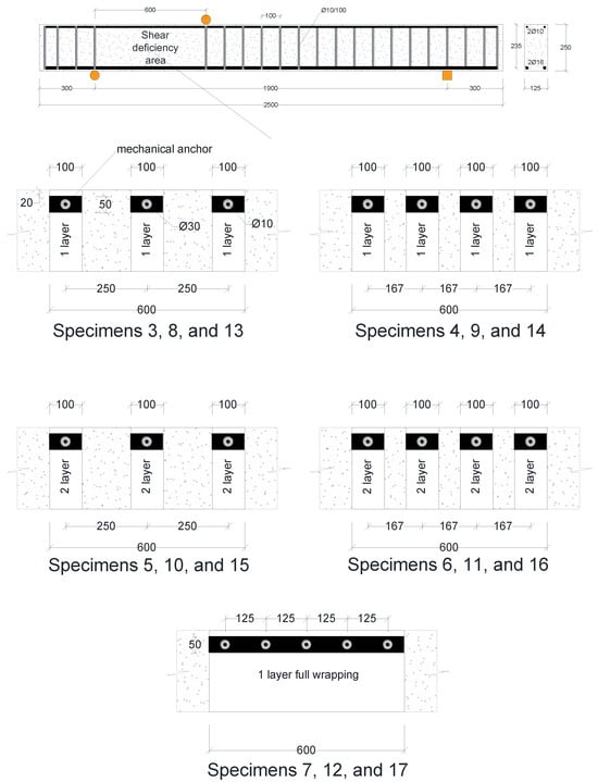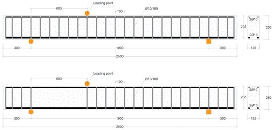 RC beam specimens had a length of 2500 mm and a rectangular cross-section of 125 × 250 mm. Two longitudinal reinforcement ribbed steel bars of ϕ16 and of ϕ10 were placed in tension and compression zones of the beams, respectively. Ribbed steel of ϕ10 was used and placed as a stirrup. Mechanical properties of the steel bars are listed in Table 5. The layout of the reinforcement of the reference beam including steel stirrups along its entire length and of the reinforcement of the other 16 beams are shown in Figure 1 and Figure 2, respectively.