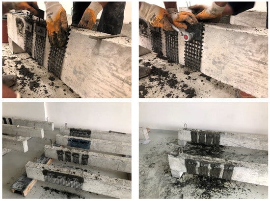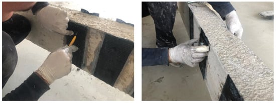 Tensile strength of carbon mesh-170 and carbon mesh-350 are 240 kN/m and 255 kN/m, respectively. These materials were bonded to the surface of the RC beams using cement-based mortar (Figure 6). Mechanical properties of the mortar and TRM textile material are given in Table 5. Tensile strength of the CFRP is 4100 MPa. CFRP layer was bonded to the surface of the RC beams by using a type of epoxy adhesive, named Sikadur-330, produced by the Sika company. Mechanical properties of the epoxy adhesive and CFRP material are given in Table 5.