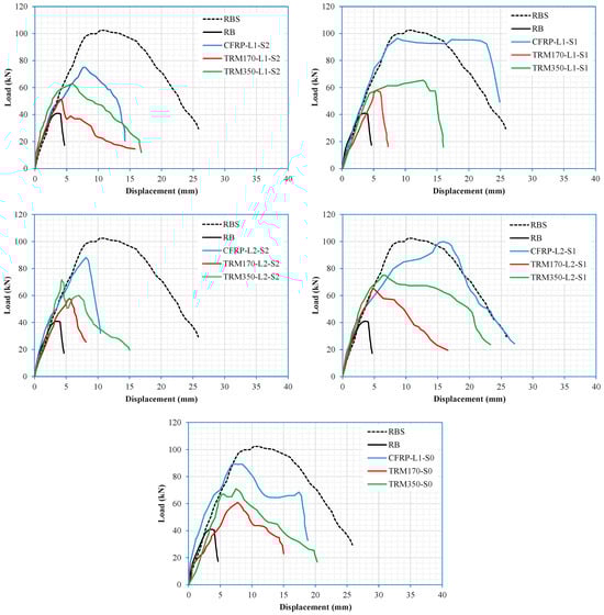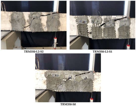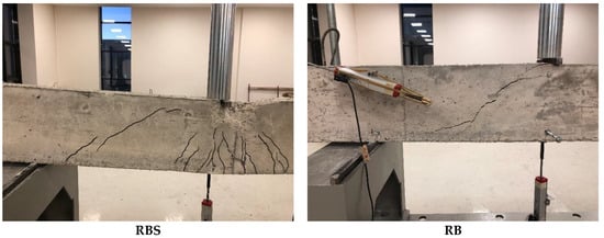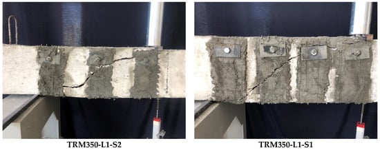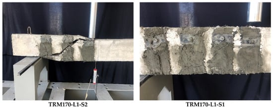 Beam specimens RB, CFRP-L1-S2, CFRP-L2-S2, TRM170-L1-S2, TRM170-L1-S1, TRM170-L2-S2, TRM170-L2-S1, TRM170-S0, TRM350-L1-S2, TRM350-L1-S1, TRM350-L2-S2, TRM350-L2-S1 and TRM350-S0 collapsed in shear failure mode and the other beam specimens RBS, CFRP-L1-S1, CFRP-L2-S1 and CFRP-L1-S0 collapsed in bending failure mode.