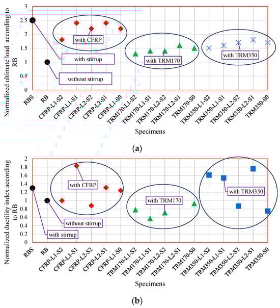 - In the beams strengthened with TRM-350, the beam specimen TRM350-L2-S1 had the highest value of the ultimate load. Its ultimate load capacity was obtained as 1.8 times that of the reference beam RB.