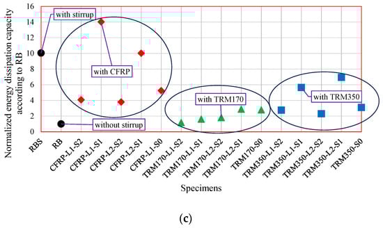 - Considering only the beam specimens strengthened with TRM-170, specimen TRM170-L2-S1 reached the highest energy dissipation capacity value. Its energy dissipation capacity value was about 30% of that of the reference specimen RBS and about 2.9 times that of the reference beam RB.