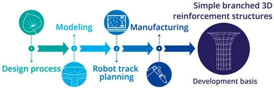 From cradle to grave, buildings produce almost 37% of global CO2 emissions [1]. The main driver of emissions in the construction sector in the European Union is the production of ordinary cement [2]. Approximately 9% of global carbon dioxide (CO2) emissions are attributable to the construction sector during the construction phase of structures alone [3]. As the growing impacts of climate change are experienced around the globe, the evidence that greenhouse gas emissions must fall is clear. The annual Emissions Gap Report of the United Nations Environment Programme concluded in 2022 that an urgent holistic transformation involving all major contributors to greenhouse gas production, such as the electricity supply, transport, and buildings sectors, is imperative for the international community not to fall far short of the goals of the Paris climate agreements [4]. This has resulted in a call to the construction industry for “completely rethought concepts for the design, modeling, construction, manufacture and use of sustainable, resource-efficient building elements made of mineral building materials” [5]. The substitution of conventional steel reinforcement with carbon fiber-based structures, which show superior mechanical performance under tensile stress and are chemically inert, is necessary to address climate change [6]. Concrete consumption can be scaled down because with textile-reinforced concrete components, there is no need for a corrosion-protective concrete overlay having no structurally mechanical benefit. In addition, it can be assumed that the service life of a structural component built with textile or carbon concrete will significantly exceed that of traditional steel-reinforced component [7]. Consequently, the extension of the service life of structural components also contributes to the avoidance of new greenhouse gases, such as CO2. The reduction in resource consumption and greenhouse gas emissions can be seen in a pedestrian and cyclist bridge built from textile-reinforced concrete (TRC) in Albstadt-Ebingen (Germany) in 2015, where the amount of concrete required was reduced by around 60% and the resulting CO2-eq. emissions were decreased by 26% compared to functionally identical steel-reinforced constructions [8]. In order to exploit the full performance potential of TRC and thus minimize concrete consumption, the traditional design principles of reinforced concrete construction must be abandoned; in addition, material substitution and intelligent design strategies, such as implementing biologically inspired load transfer principles, must be developed [9]. Robot-assisted manufacturing technology is able to meet this urgent demand for a production technology realizing three-dimensional (3D) reinforcement structures with a complex, hierarchical, and inner-branched textile topology in order to faithfully reproduce load transfer mechanisms from nature, such as in peltate leaves [10,11]. Industrial robots are designed to perform a wide range of tasks in a variety of settings. Some common tasks that industrial robots are used for include material handling, assembly, inspection and quality control, packaging and palletizing, welding and cutting, painting and coating, and machine tending. Figure 1 shows the schematic process flow of the developed technological robotic manufacturing process for spatially branched 3D non-metallic reinforcements imitating biological plant structures.