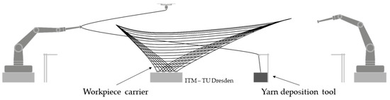 Robot-assisted yarn deposition technology from ITM TU Dresden for the production of two-dimensional textile reinforcement structures, as schematically shown in Figure 2a according to von Zuben et al. [17].