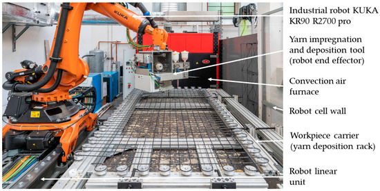 Various hardware and software components are required for the development process. Essential hardware components of the production technology are the robot system, consisting of the articulated robot with six axes, the linear unit, the surrounding safety cell, and the control and regulation technology as well as the yarn deposition rack (workpiece carrier) and the yarn impregnation unit handled by the robot (see Figure 5). In addition, different fiber materials and impregnating agents are used in the course of investigations into the influence of materials and processes. Several materials are used in the robotic yarn placement technology and are elucidated below.