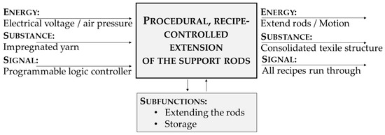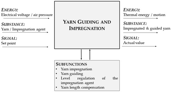 The requirements result from the previously mentioned development process, the requirements on the part of the construction industry, and the bionic target structures (Figure 7) to be realized. The resulting functional structure is depicted in Figure 11. Sub-functions of the FM 2 are the yarn guiding and impregnation themselves as well as the regulation of incoming signals, such as the filling level of the impregnation box, the decoiled yarn path, and the air pressure.