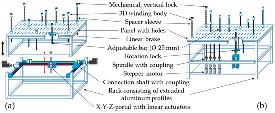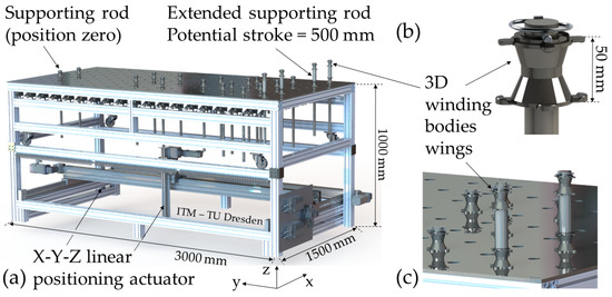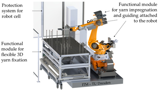 The developed overall design (Phase IV) of the functional modules is shown in Figure 14 with the final yarn fixation module (workpiece carrier) and in Figure 15 with the comprehensive robot-assisted manufacturing technology, including the yarn impregnation module (yarn deposition tool). The yarn fixation module has a dimension of 3000 mm × 1500 mm × 1000 mm (L × W × H).
