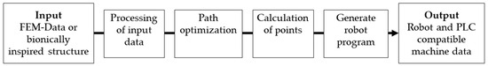 For the control of the kinematic chains (FM 1 and FM 2), the development of a qualified tool that automatically generates the robot paths as well as the timed travel paths of the FM 1 is required. The automatic path planning of robots is a highly challenging problem [37]. Nonetheless, an algorithm for the implementation of flexible axis-variable roving paths was developed as the basis for an automated realization of bionic and geometrically complex reinforcement geometries into the robot control technology as well as for automated path planning. Figure 13 schematically visualizes an innovative algorithm principle for the fully automatic generation of the robot path for yarn deposition processes, with the aim of manufacturing highly complex and biologically inspired fiber-reinforced composite structures. The algorithm processes input data obtained from computer-aided simulations or directly from botanically inspired designs. The outputs in this process step are variables containing geometrical information, such as the number and position of nodes and connections between these nodes in form of node pairs. The robot-assisted production of the desired structure can be abstracted as the solution to the Chinese postman problem, where the result is an optimized and holistic path including all nodes and node connections [38]. The developed pathfinding algorithm, based on Hierholzer’s algorithm, utilizes the basis information and further processes it, leading to an optimal node sequence taking into account the structural geometry, such as the path length, orientation, and cross-section of the deposited fibers, as well as deposition constraints, such as fiber angle and slippage, as well as minimal fiber damage and minimizing of wrapping of nodes.