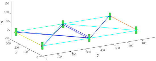 Automatically generated robot path for the yarn deposition of a simple 2D non-metallic reinforcement structure: green pins—winding bodies; strands with different colors according to the already deposit yarn strand counts (turquoise = 2 strands; blue = 3 strands; green = 4 strands; yellow = 5 strands; orange = 6 strands).