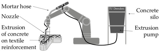 In the future, the system control of the production line must be finalized. For this purpose, the synchronization between the robot control and the control unit of the yarn fixation module as well as the use of the rotatory tool center point movements must be developed and tested to ensure sufficient process stability for the upcoming investigation work. After successful algorithm development, biologically inspired geometries can be transformed into machine datasets and thus deposition paths. In addition, the reinforcement structures found are to be evaluated in close cooperation between the subprojects in the Collaborative Research Center Transregio 280, and strategies for the generative production of concrete structures with such innovative 3D reinforcement are to be formulated. The focus is on automation, dimensional accuracy, and sustainability in the form of material reductions. In investigations covering the process chains, fundamental requirements for the concreting possibility of 3D textile reinforcement via additive manufacturing are to be determined. Figure 17 shows the technological approach to be used for processing of the reinforcement textiles by means of additive concrete extrusion [39]. In subsequent research work, technological suitability for further processing in generative concrete production is to be evaluated by characterizing dimensional stability and composite behavior with concrete.