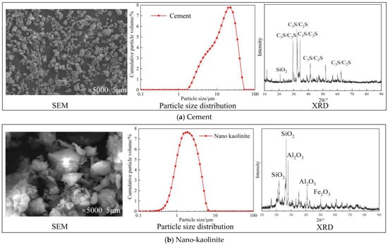 The cement used in this study was P•O42.5R ordinary Portland cement; its chemical composition is detailed in Table 1. The test mixing water was tap water. The nano-clay material chosen for this paper was nano-kaolinite, which is refined by crushing raw kaolinite ore with a crusher, then using an impact mill for 40 min of ultra-fine grinding [31], and then calcining it. Its physical index, chemical composition, and activity index are detailed in Table 2, Table 3 and Table 4. The cement and nano-kaolinite characteristics are shown in Figure 1.
