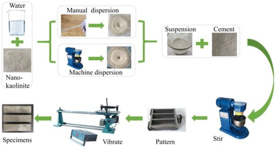 The nano-kaolinite was mixed with water and stirred for 3 min using both manual dispersion and mechanical dispersion to make nano-kaolinite suspensions, which were stirred with cement according to the water–cement ratio of 0.5 to make cement paste. This was then poured into the test mould to make a prismatic cylinder of 40 mm × 40 mm × 160 mm, and then, after being removed from the mould, it was placed into a standard maintenance box to maintain it to the specified age for 24 h at a standard temperature of 20 ± 1 °C and relative humidity of ≥95%. The specimen preparation process is shown in Figure 2.