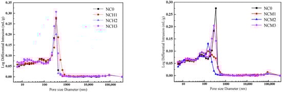 The most probable pore diameter is the peak pore diameter on the differential curve of the pore diameter distribution. In other words, the pore diameter with the largest number of pores in the specimen [35]. The pore diameter distribution can be reflected, to some extent, by the maximum pore diameter; the smaller the maximum pore diameter, the smaller the corresponding average pore diameter, and the more pronounced the refinement of the pore structure. On the contrary, the larger the maximum pore diameter, the looser the pore structure. The differential curves of the cement specimens are shown in Figure 4, the most probable pore diameters are shown in Table 8.