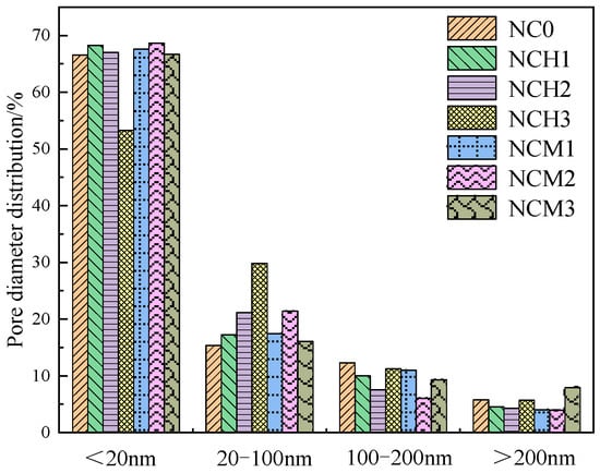 The pore diameter distribution of the cement specimens is shown in Figure 5. The effect of porosity on strength varies in each pore class. In this study, the pores of the cement materials were classified into four types of pores, harmless pores (less than 20 nm), less harmful pores (20–100 nm), harmful pores (100–200 nm), and more harmful pores (greater than 200 nm) [36]. After the addition of the nano-kaolinite, the proportion of harmful pores and more harmful pores decreased to different degrees, while the proportion of harmless pores and less harmful pores increased. That is, the pore size distribution developed into smaller pores. It can be concluded that the pore structure becomes dense after doping with nano-kaolinite. This indicates that nano-kaolinite can refine the pores and make the pore diameter develop towards a smaller pore diameter. Both manual dispersion and mechanical dispersion showed the highest percentage reduction of harmful pores and more harmful pores at 1% nano-kaolinite doping, but the refining effect gradually weakened when the nano-kaolinite doping exceeded 1%. This indicates that the agglomeration of nano-kaolinite occurs when the nano-kaolinite is dosed too much, which leads to a less obvious refinement effect and affects the pore diameter distribution of the cement specimens to some extent. By comparing the two dispersion methods, it can be seen that mechanical dispersion has a slightly better refinement effect on pore diameter distribution than manual dispersion, which also indicates that mechanical dispersion better disperses the nano-kaolinite, so it can play its role of filling pores and achieve the effect of refining pore diameter.