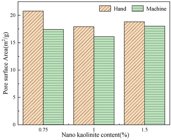 The pore surface area of the cement specimens is shown in Figure 6, which shows that the pore surface area of the mechanically dispersed specimens is lower than that of the manually dispersed specimens. This indicates that the mechanical dispersion achieves better dispersibility, so the nano-kaolinite is better dispersed and decreases the pore surface area. When the dosage was increased to 1.5%, the improvement effect was reduced. This is because the amount of nano-kaolinite is too much to cause uniform dispersion.
