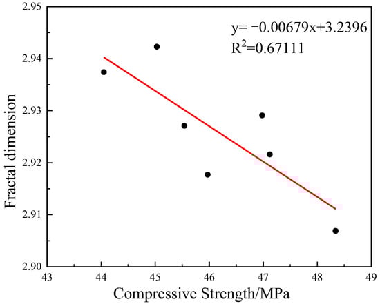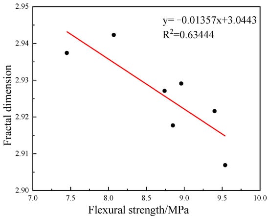 The relationship between the surface fractal dimension and the flexural and compressive strength of the nano-kaolinite cement specimens is shown in Figure 7 and Figure 8. This indicates that the surface fractal dimension can characterise the flexural and compressive strength of the cement specimens, to some extent, and that incorporating nano-kaolinite increases the cement specimens’ flexural and compressive strength and improves the cement specimens’ internal complexity. The fractal dimension can reflect the relationship between the microscopic pore structure characteristics and mechanical properties of cement specimens.