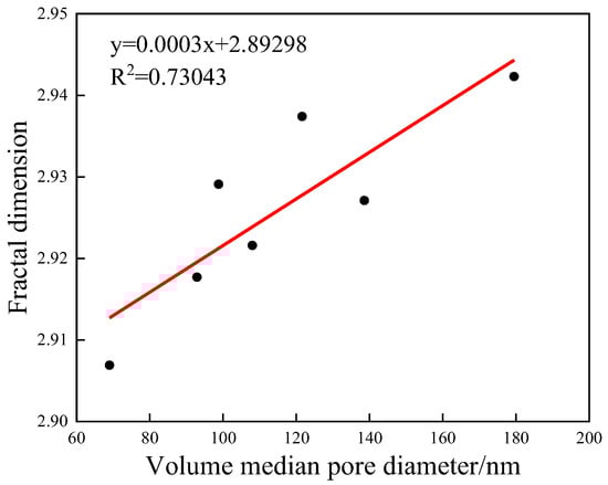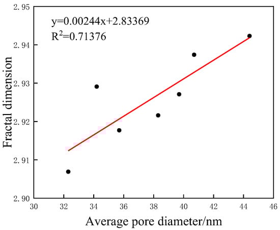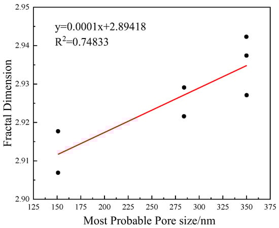 Figure 9 shows the surface fractal dimension as a function of the most probable pore diameter. It can be seen that the surface fractal dimension increases with the increase in the most probable pore diameter. This shows that the surface fractal dimension correlates well with the most probable pore diameter, consistent with Han et al. [37]. The smaller the surface fractal dimension, the smaller the corresponding most probable pore diameter, and the smaller the corresponding average pore diameter, the more obvious the refinement of the pore structure and the lower the complexity of the pores. This means that nano-kaolinite reduces the complexity of the pores while reducing the most probable pore diameter.
