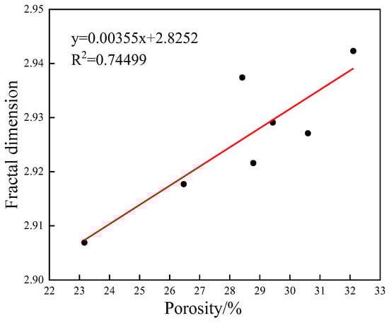 Figure 10 shows the relationship between the surface fractal dimension and the porosity. It can be seen that as the porosity increases, the surface fractal dimension also increases. The porosity characterises the amount of pore space within the cement-based material. The surface fractal dimension of the specimens doped with nano-kaolinite decreases as the porosity decreases, implying that the nano-kaolinite reduces the complexity of the pores while reducing the porosity.