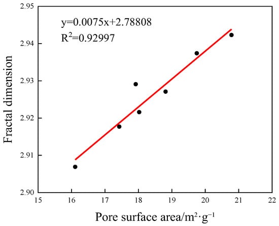 where D is the surface fractal dimension, and C is a constant. The slope of the linear fit using Equation (3) is the surface fractal dimension, D. The surface fractal dimension of the Zhang model is in the range of 2 < D < 3; when the surface fractal dimension is close to 2, the pore surface is smooth, and when the surface fractal dimension is close to 3, the shape becomes more complex.