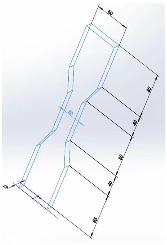 The experimental mixing ratios are shown in Table 3. This experiment investigated the effect of the RMP substitution rate and the PP volume content in RMP-PP-ECCs on their compressive strength, uniaxial tensile strength, and flexural strength. The compressive strength was tested using a 70.5 mm × 70.5 mm × 70.5 mm cube specimen, the flexural strength was tested using a 40 mm × 40 mm × 160 mm specimen, and the uniaxial tensile strength was tested using a dog-bone-shaped specimen with a cross-sectional area of 14 mm × 30 mm as shown in Figure 3. The mechanical properties of the three specimens were tested after 7 and 28 d of curing in the curing room. The anti-chlorine ion penetration test was carried out using cylindrical specimens with a diameter of 100 mm at the base and a height of 50 mm, and the frost resistance test was carried out using 100 mm × 100 mm × 400 mm RMP-PP-ECC specimens cast and molded for 24 h. After 24 h of molding and curing in the curing room (temperature (21 ± 1) °C, humidity of 96%) for 28 d, subsequent resistance to chlorine penetration and anti-freezing performance tests were conducted.