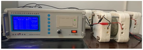 The resistance to chloride ion penetration test refers to the electric flux method in GB/T 50082-2009 [], which records the passing flux. The electric flux test was carried out using a multifunctional concrete durability synthesizer, as shown in Figure 5. The current is recorded every 5 min through the automatic data collection function until it reaches 6 h. The current versus time is plotted according to the recorded data, and the area integral of the curve is used to obtain the electric flux (C) of the test for 6 h. Finally, the calculated electric flux is converted into the electric flux of the specimen with a diameter of 95 mm according to the following formula. As shown in Equation (1):