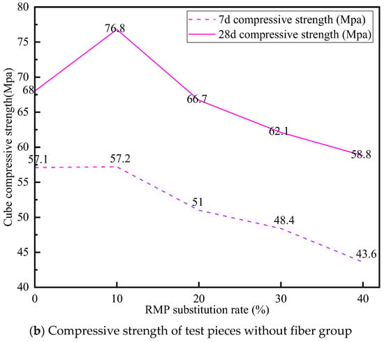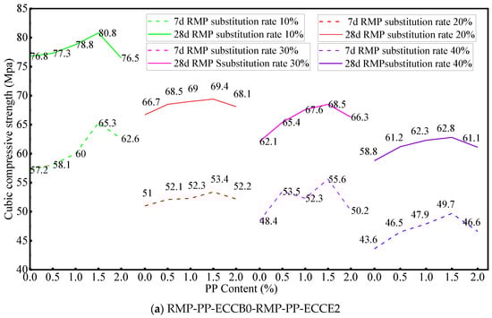 The RMP-PP-ECC specimens were cured according to the schedule for 7 and 28 d, the compressive strength values of the RMP-PP-ECC specimens at each age were determined, and the conclusions were drawn based on Figure 12. The best compressive performance was achieved when the RMP substitution rate was 10% and the PP fiber doped was 1.5%. The 28 d compressive strength increased by 23.7% compared to the 7 d compressive strength. The 28 d compressive strength increased by 18.8% compared to RMP-PP-ECCA0. Due to the high coefficient of friction of PP, they can form a good fiber–cementitious lattice structure in the RMP-PP-ECC, which can carry the loads along with the cementitious matrix. This disordered grid structure can delay the development of internal cracks and enhance the toughness and strength of the RMP-PP-ECC. The experimental results show that the compressive strength of the RMP-PP-ECC reaches the maximum value when the fiber content is 1.5%. In addition, the RMP-PP-ECC was prepared by replacing some of the cement with RMP, the RMP-PP-ECC, which can carry the loads along with the cementitious matrix. This disordered grid structure can delay the development of internal cracks and enhance the toughness and strength of the RMP-PP-ECC. The experimental results show that the compressive strength of the RMP-PP-ECC reaches the maximum value when the fiber content is 1.5%. In addition, the RMP-PP-ECC was prepared by replacing some of the cement with RMP, and it was found that the compressive strength of the RMP-PP-ECC increased slightly when the substitution rate was 10%, but when the substitution rate was more than 10%, the compressive strength of the mortar decreased at all ages, with the increased water requirement for fluidity being the primary factor contributing to the reduced strength in the RMP-PP-ECC, particularly at lower substitution rates. Conversely, the use of recycled coarse aggregate from waste concrete, with its high alkalinity and alkaline-environment-induced volcanic ash effect, results in the formation of C-S-H gel through chemical reactions. This C-S-H gel effectively fills the internal pores of the RMP-PP-ECC, enhancing its microporous structure. In addition, inactive particles in RMP serve as macroaggregates, filling the cement paste in the matrix. Consequently, lower RMP substitution rates are beneficial for improving the strength of the RMP-PP-ECC. However, when the RMP substitution rate exceeds 10%, it has an adverse effect on the concrete’s compressive strength. This adverse impact is attributed to the increased water demand for a specified fluidity. As the RMP substitution rate rises, the cement content in the corresponding RMP-PP-ECC diminishes, leading to a reduction in C-S-H gel content within the hydration products and, consequently, a decline in the strength of the RMP-PP-ECC [,,].