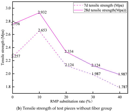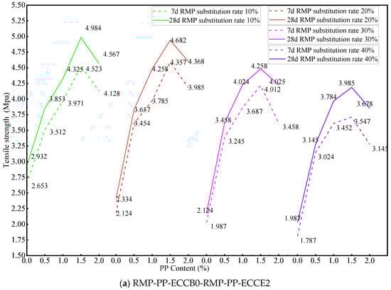 The RMP-PP-ECC specimens were cured for 7 and 28 days according to the schedule, and the tensile strength values of RRMP-PP-ECC at each age were determined. According to Figure 14. When the RMP substitution rate is 10%, and the PP fiber doping is 1.5%, the tensile performance is the best, and the 28 d tensile strength increases by 10.2% compared with the 7-day tensile strength. The tensile strength growth is small; the reason is similar to the flexural strength, which is due to the RMP particle size being small while the specific surface area is large. As a result, in the early stage, it can absorb more water for the hydration reaction, generating more gelling material, and the later hydration reaction to generate the gel material is reduced, thus resulting in the late tensile strength growth being slow. The 28 d tensile strength increased by 80.8% compared to RMP-PP-ECCA0. When the RMP-PP-ECC specimen is under the action of tensile force, the fiber plays a good tensile property and bridging role in the process, which makes the tensile strength increase to a certain extent. When the fiber content exceeds 1.5%, the excessive fiber incorporation makes it easy to adhere during the mixing and processing of cementitious materials, the fiber-specific surface area is larger, and the specimen contains more weak layers, which destroys the optimal structure of the specimen, resulting in a reduction in tensile strength. When the RMP substitution rate is 10%, RMP-PP-ECC has the best tensile performance, and the tensile strength of RMP-PP-ECC is slightly improved compared to ordinary engineered cementitious composites. However, when the RMP substitution rate is more than 10%, the flexural strength of RMP-PP-ECC starts to decrease gradually. The reason is that RMP has a large specific surface area, and the ultrafine powder not only makes the cement better dispersed in the matrix and increases the hydration contact area of the cement but also exposes a part of the unhydrated particles contained in the RMP after deep grinding, which makes the RMP show better hydration activity and improves the tensile strength, but with an increase in the substitution rate of RMP, the RMP absorbs a large amount of water used in the mixing and the amount of water required for the hydration of the cement decreases. The water requirement used for hydration is reduced, leading to the obstruction of cement hydration; on the other hand, the large dosage substitution of cement by RMP leads to the reduction in cement dosage, which reduces the C-S-H content of the hydration products and leads to the reduction in the tensile strength of RMP-PP-ECC [].