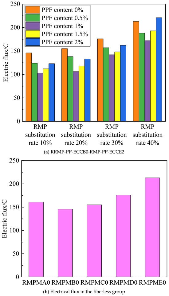 As shown in Figure 18, the variation in anti-chlorine ion permeation properties of RMP-PP-ECC with different RMP substitution rates when the PP content is 0%. With the increase in fiber doping of the RMP substitution rate, the electrical flux of the RMP-PP-ECC exhibits a trend characterized by a gradual decline followed by a subsequent increase. In the RMP with the substitution rate of 10%, the electrical flux of the RMP-PP-ECCB0 is observed to exhibit a reduction of 10.3% when compared to the baseline group, when the RMP substitution rate of 10%, 20%, 30%, and 40%, the electric flux exhibits an initial increase followed by a subsequent drop upon the introduction of fiber doping, the rise in electric flux is more pronounced when the RMP substitution rate exceeds 30%. The reason is similar to the mechanical properties, which is due to the uneven particle size of the RMP particles and the increase in the amount of water required to keep the mortar with a certain degree of fluidity. Furthermore, RMP contains elevated levels of alkaline substances, and its volcanic ash effect occurs in alkaline environments. The resultant C-S-H gel can effectively occupy internal voids within RMP-PP-ECC, enhancing its microporous structure. Meanwhile, the non-reactive particles in RMP act as minuscule aggregates, filling the cement mortar matrix. Therefore, when the RMP substitution rate is low, it is favorable to improve the performance of RMP-PP-ECC against chloride ion erosion. However, when the RMP substitution rate is greater than 30%, RMP adversely affects the chloride erosion resistance of RMP-PP-ECC due to the uneven particle size of the RMP particles and the increase in the amount of water required to keep the mortar with a certain degree of fluidity. With an increasing RMP substitution rate, the low reactivity of RMP-PP-ECC results in a reduction in hydration products, leading to an increase in porosity and microcracks within RMP-PP-ECC. Correspondingly, the cement content in RMP decreases. Furthermore, the decrease in C-S-H gel content in the hydration products also contributes to a decline in the chloride ion resistance performance of RMP-PP-ECC. When the RMP substitution rate is 10% and PP content is 1.5%, the electric flux is the smallest, which is decreased by 56.3% compared to the control group. This is because due to the smooth surface of PP, the internal structure of the fiber combined with the fiber reduces the permeability by preventing the expansion of the tiny cracks, and the impregnating medium can not penetrate into the interior of the fibers, which reduces the degree of deterioration of the RMP-PP-ECC specimen, PP reduces the permeability by preventing the expansion of the tiny cracks. PP reduces permeability by preventing the expansion of tiny cracks [,].