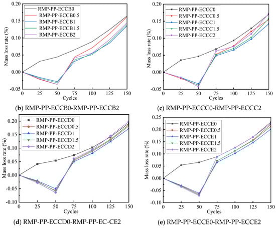 As shown in Figure 19, the effect of freeze–thaw cycles of 0, 25, 50, 75, 100, 125, and 150 times on the RMP-PP-ECCB1.5 specimens’ resistance to freeze–thaw damage is illustrated. After 75 freeze–thaw cycles, on the specimen surface, there is a small amount of mortar fall off, there is a little bit of fiber precipitation, and a small number of small cracks and holes can be observed; the damage on the surface of the RMP-PP-ECC is relatively small, and a slight slagging appeared in part of the area. After 100 cycles of freezing and thawing, the surface of the RMP-PP-ECC specimen exhibits extensive mortar spalling, numerous microvoids, and a small number of missing corners; the degree of damage is more serious, a serious slagging and shedding phenomenon has appeared in the surface area. After 150 freeze–thaw cycles, the phenomenon of mortar shedding is further aggravated, a large number of corners are missing, and the holes have also further expanded. The freeze–thaw damage of the specimens was so severe that significant slagging and shedding had occurred in the surface area. When conducting rapid freeze–thaw experiments, the internal structure of RMP-PP-ECC will be damaged to a certain extent after a certain number of freeze–thaw cycles. Therefore, by analyzing the mass-loss rate of RMP-PP-ECC, the freeze–thaw durability performance of RMP-PP-ECC can be effectively evaluated. Figure 20 shows the mass-loss rate of RMP-PP-ECC under different numbers of freeze–thaw cycles. It can be seen that when the number of freeze–thaw cycles is 0–50 times, the mass of RMP-PP-ECC doped with PP increases. The reason for this is that firstly, as the temperature decreases, the specimen freezes in the water retention state, and the freezing and expanding force generated when the water freezes into ice squeezes the unfrozen water in the capillary pores out of the gel and transports this water into the crystals in the pores, which causes these crystals to grow continuously, resulting in the generation of micro-cracks in the organism. Additionally, with the breaking of the freeze–thaw cycle, the PP fiber is exposed to the microcracks in the specimen. During the process of thawing, it also absorbs the surrounding water through capillary adsorption, such that the quality of the specimen increases. With the increase in the number of freeze–thaw cycles, the water molecules in the RMP-PP-ECC began to be saturated and, after much reciprocal freezing, produced stress, which in turn caused freeze–thaw cycle damage inside the RMP-PP-ECC resulting in the phenomenon of slagging and peeling off the surface of the RMP-PP-ECC and the gradual decrease in the mass of the specimen. As the number of freeze–thaw cycles continued to increase, the freeze–thaw damage accumulated, resulting in a gradual increase in the rate of mass loss of the RMP-PP-ECC soil. RMP-PP-ECCB0 performed the best among the non-fiber-reinforced specimens with 0.044% mass loss after 50 cycles and 0.16% mass loss after 150 cycles, and RMP-PP-ECCB1 performed the best among all the specimens with 0.031% mass gain after 50 cycles and 0.13% mass loss after 150 cycles.