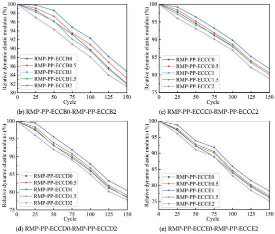 As Figure 21 shows, the changes in the relative dynamic elastic modulus of RMP-PP-ECC under different numbers of freeze–thaw cycles, it is obvious from the figure that the relative dynamic elastic modulus of RMP-PP-ECC decreases continuously with the gradual increase in the number of freeze–thaw cycles. In addition, the relative dynamic elastic modulus of RMP-PP-ECC shows a tendency to increase and then decrease with the gradual increase in RMP substitution rate and fiber content. Among the specimens without fiber doping, RMP-PP-ECCB0 has the best performance, with the relative dynamic elastic modulus decreasing by 3.9% after 50 freeze–thaw cycles and the relative dynamic elastic modulus decreasing by 17.9% after 150 freeze–thaw cycles. RMP-PP-ECCB1 showed the best performance among all the specimens, with a decrease of 1.4% after 50 freeze–thaw cycles and a decrease of 15.2% after 150 freeze–thaw cycles. The effect of the change in RMP substitution rate on the frost resistance of RMP-PP-ECC was analyzed: when RMP replaced part of the cement material, the amount of cement used was reduced, and the amount of unhydrated cementitious material was reduced when it entered the hydration stage. Due to the small particle size of RMP, it can be uniformly distributed in the cement paste after replacing cement in appropriate amounts, which not only can become the core of hydration products but also can effectively fill the pores and micro-defects in RMP-PP-ECC, thus improving the pore structure and densification of RMP-PP-ECC. This can reduce the entry of environmental water molecules and thus improve the frost resistance of RMP-PP-ECC. At the same time, PP demonstrates hydrophilicity and good bonding with cementitious materials, which can reduce the shrinkage cracks produced by mortar in the process of early maintenance, reduce the cracks produced by the shrinkage of mortar in the process of freezing and thawing repeatedly, and inhibit the development of cracks to increase the toughness of the specimen in the process of freezing and thawing repeatedly; on the other hand, the mixing of PP reduces the internal pore space in the RMP-PP-ECC, reduces the freezing point of the pore space, and thus improves the frost resistance of RMP-PP-ECC [,,,].