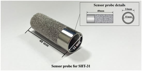 As observed in a previous study, the location of sensor housings can significantly impact the compressive strength of mortar; however, the effect may differ in the case of concrete. To test this, the study investigates the influence that varying the embedding depth of sensor housings relative to the concrete cover thickness has on compressive strength. The experiments were conducted to identify a sensor housing location that adheres to the necessary compressive strength requirements. The sensor utilized in this study was the SHT-31 humidity and temperature sensor manufactured [20] by the same model used in the preceding research. Recognized for its precision and reliability, the SHT-31 has been widely employed across multiple sectors. In building automation systems, the sensor assists in maintaining optimal environmental conditions through air quality monitoring, ensuring efficient energy consumption [21]. It also finds utility in agriculture, optimizing growth conditions for crops [22], and plays a pivotal role in public infrastructure safety monitoring [23]. Such applications emphasize their potential to provide real-time insights, preemptively identify anomalies, and facilitate immediate responses. The housing specifications for this sensor are shown in Figure 1, with dimensions of 40 mm in length, 14 mm for the external diameter, and 11 mm for the internal diameter.