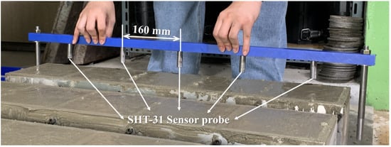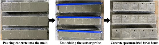 The sensor housing used is made of a copper–nickel-plated material. Although copper is non-magnetic [24], the nickel plating gives the housing magnetic properties [25]; therefore, rods were designed to hold the sensor housings at the predetermined embedding depths via magnets, as depicted in Figure 2. Then, 10 mm-diameter magnets were positioned at 160 mm intervals on the rod. This arrangement ensured a secure attachment of the housings to the rods, preventing any movement within the mortar during the curing process. After 24 h of curing, the rods were detached from the concrete, leaving only the sensor housings embedded at consistent intervals. The process of sample manufacturing is illustrated in Figure 3.