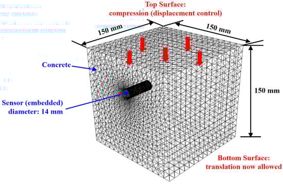 In this study, the damage-plasticity behavior of concrete samples with embedded sensor housings was analyzed by simulation as a function of the sensor housing embedment depth. The material constants of the concrete and the sensor housing used in the simulation are given in Table 1. The sensor housing’s material properties were considered to be similar to those of a copper–nickel alloy, and data regarding the sensor housing’s material attributes were extracted from Mat-Web: Online Materials Information Resource [30]. The material constants for concrete were taken from [31]. Ten-node quadratic tetrahedral (C3D10) elements were used for both the concrete and the sensor housing, with 87,796 elements and 104 elements for the concrete and sensor housing, respectively. The boundary conditions were set to prevent deformation on the bottom surface, with the specifics depicted in Figure 4.