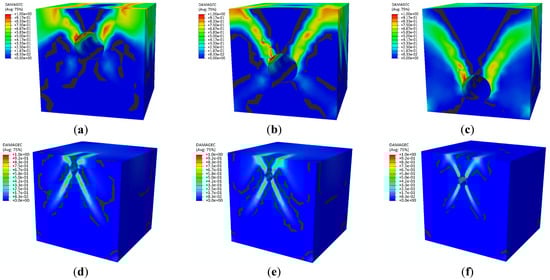 Contours showing the compressive damage factor () for various embedment depths: (a) 10 mm in mortar, (b) 20 mm in mortar, (c) 30 mm in mortar, (d) 10 mm in concrete, (e) 20 mm in concrete, and (f) 30 mm in concrete.