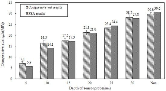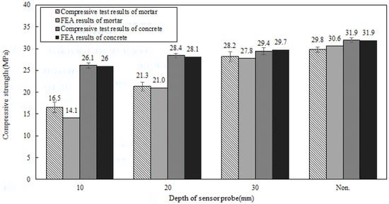 Figure 8 shows the concrete compressive strength in this research alongside the findings from the FEA. Due to the larger size of the concrete samples compared to the mortar samples and the presence of gravel, which makes fine adjustment challenging, the depths were set at 10 mm intervals. Samples with depths of 10 mm, 20 mm, and 30 mm were prepared for testing. The experimental results confirmed that, similar to the mortar samples, the concrete compressive strength also increased as the depth of the sensor housing from the surface increased. The FEA likewise reflected this trend well.