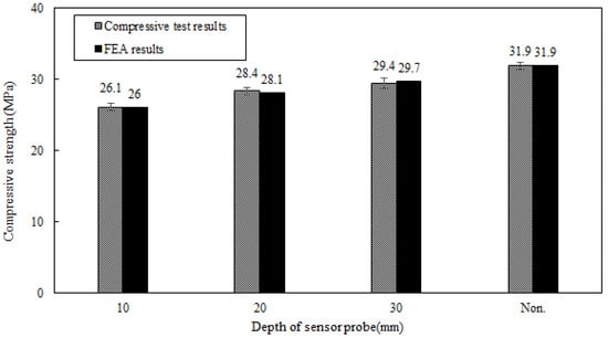 Figure 7 portrays the mortar sample’s compressive strength from the preceding research and the finite element analysis (FEA) outcomes. Compressive strength assessments were carried out on mortar samples with sensor housings embedded at depths from 5 mm to 30 mm in 5 mm steps to discern the effect of sensor housing embedding at varying depths. The obtained experimental findings affirmed that a deeper sensor housing embedding led to enhanced compressive strength. This trend was also mirrored in the FEA results, thus supporting the validity of the experimental observations.