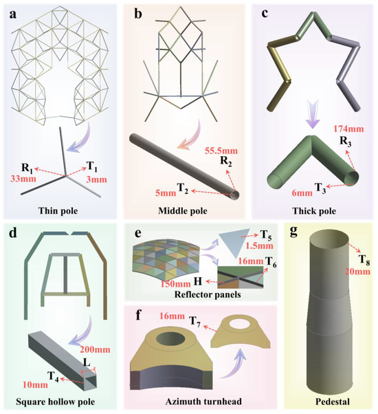 - To reduce z-direction deformation of the overall structure for the radio telescope to a greater extent by decreasing T1, R1, T3, R3, H, and T7 and increasing R2, T2, L, T4, and T8.