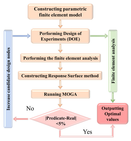 - MOGA parameter optimization: the optimization of the structural dimensional parameters of the radio telescope to minimize the dynamic response was carried out using the MOGA optimization function. The guidelines for this procedure were referenced from the DesignXplorer User’s Guide in ANSYS Workbench 2020R2 software [44].