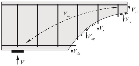 Due to the complex load-bearing mechanisms that occur after exceeding the tensile strength of concrete, the shear behavior of RC structures is still not fully understood, even today [26]. Because the various load-bearing mechanisms are currently described differently using simplified models and design approaches, there is currently no universally accepted, physically based model [26]. However, the approaches presented in [27,28] allow for a relatively accurate calculation of the shear capacity of RC structures. The load-bearing mechanisms occurring at different loading stages in the shear crack, as shown in Figure 1, are weighted differently in research.